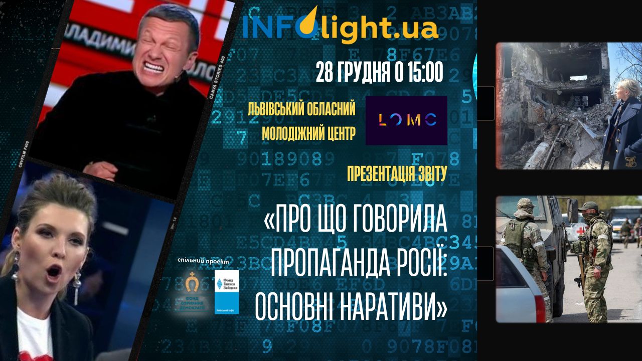 У середу, 28 грудня, о 15:00 в Львівському обласному молодіжному центрі відбудеться презентація звіту за 2022 рік Дослідницько-аналітичної групи проекту InfoLight.UA «Про що говорила пропаганда росії: основні наративи».
