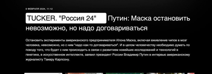 Українська Правда повідомляє про те, що американський журналіст і колишній ведучий Fox News Такер Карлсон, який у лютому 2024 року взяв інтерв’ю в Путіна, уже тривалий час представлений у російському телеефірі. У матеріалі зазначено, що його шоу транслюється на телеканалі «Россия 24» не з 2024 року, як раніше помилково повідомлялося, а з вересня 2023 року.